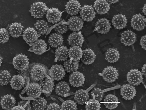 The common puffball is a type of fruiting body of a fungus that grows in rotting wood. The spores grow inside this type of mushroom within a spherical sac called the peridium. It has a single hole in the top. Once they mature, the mushroom becomes somewhat shrunken. With the slightest touch, it bursts open, releasing a cloud spores that look like a puff of smoke, which is why it gets its name. Each spore is connected to a turgid filament-like tube called a paraphyses that helps to provide the elastic prestress needed for spore ejection. Below are the puffball spores in 3 scanning electron microscope (SEM) images of increasing magnification. They are quite tiny ~ 4 mm (4 millionths of a meter) in diameter. A human hair ranges from 25 – 75 um in diameter. What’s left of the filament tube (paraphyses) assisting is clearly visible in the highest magnification taken at 10,000X.